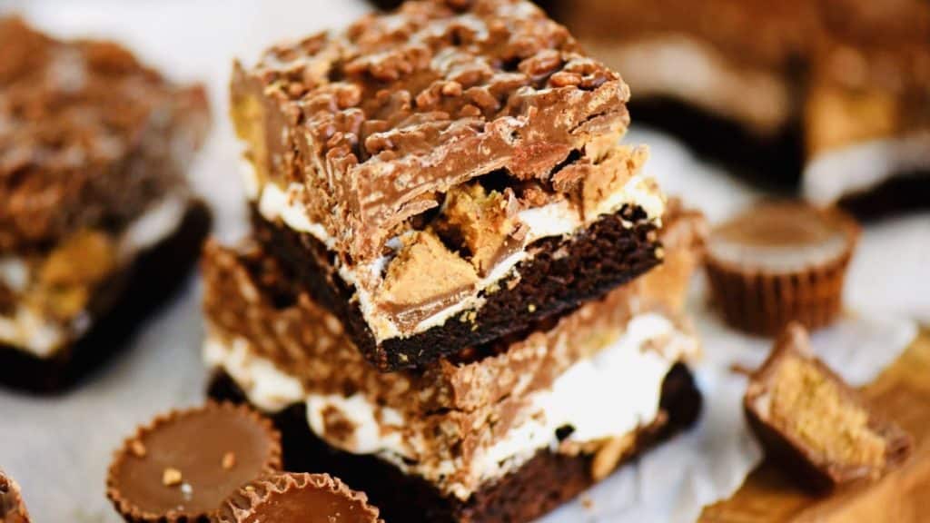 The prep time to get all these ingredients ready to go is 15 minutes. The actual cook time for making these Reese’s marshmallow brownie bars is 30 minutes. So in around 45 minutes, you can have this fantastic Reese’s peanut butter cup topped brownie dessert ready to serve to your party guests.